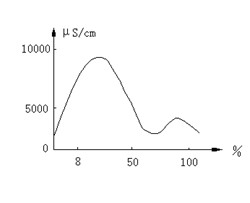 由于酸堿溶液對應電導關系的特殊性,致使電導池內無溶液時,變送器輸出并不是恰好在零位,而是偏低零點以下(見圖五)。